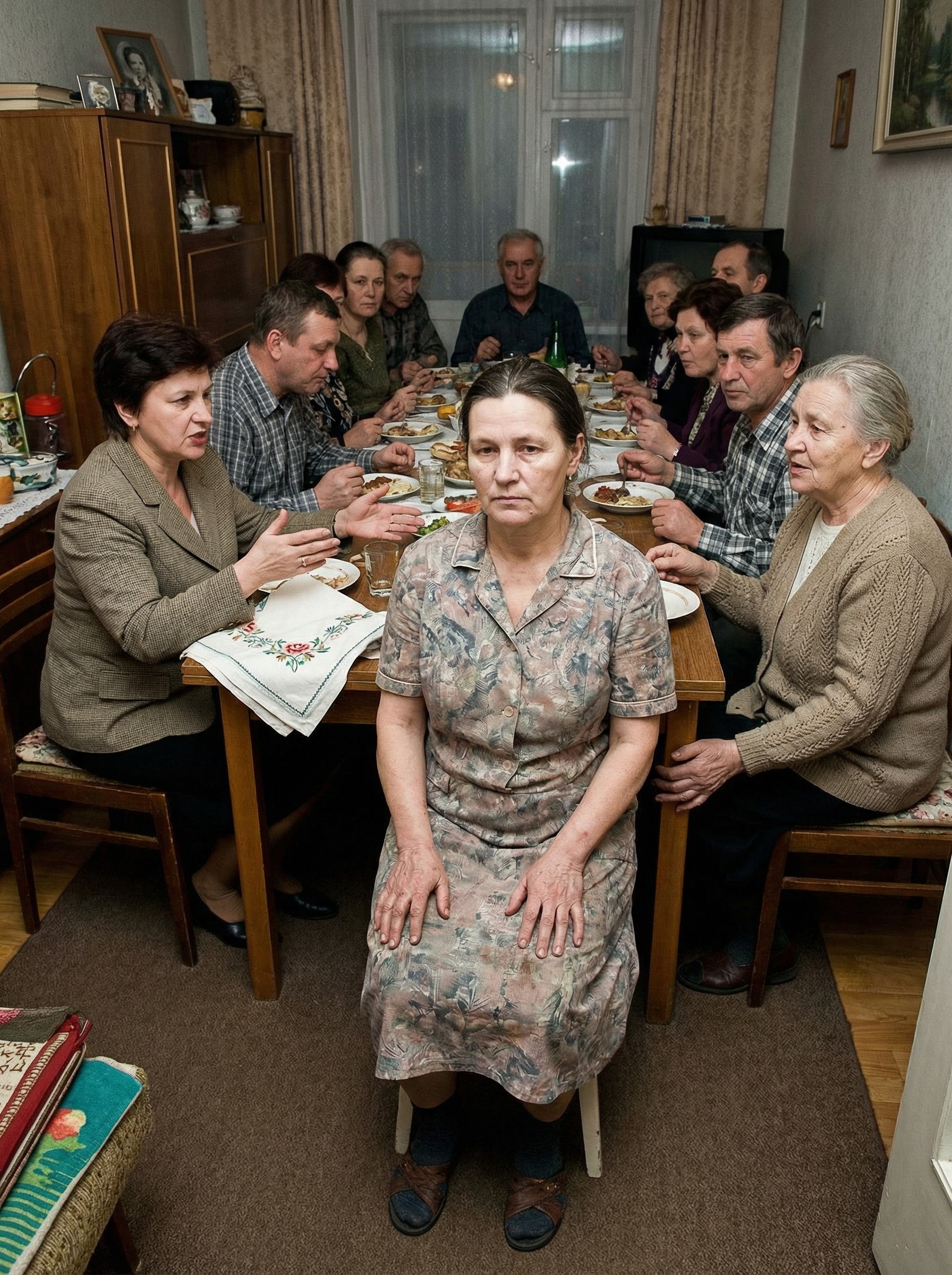 A vendégek még mindig nem szóltak. Egy idősebb asszony, aki az asztal végén ült, lassan letette a villáját.