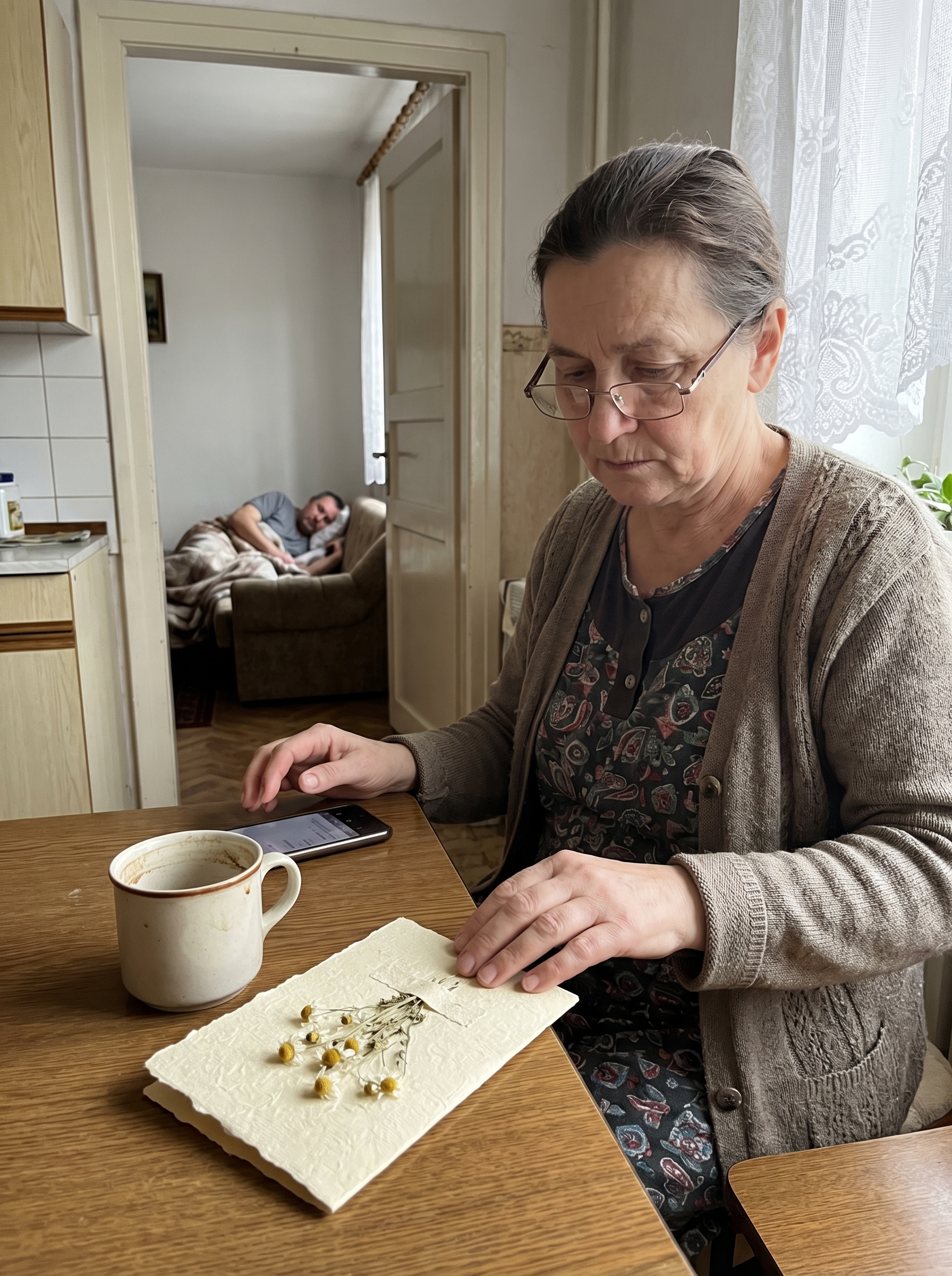 A lap az asztal sarkán hevert, ott, ahol reggel a kávéját szokta inni. Kézzel készített képeslap volt, halvány krémszínű kartonból, a szélein préselt mezei virágok — egy szál kamilla, két lila here, valami apró sárga virág, aminek nem tudta a nevét. Margit küldte, három napja. Csak annyit írt belülre: *Neked sikerülni fog.* Sem dátum, sem hosszabb szöveg. Csak ez az öt szó, és az aláírás, ami nem is aláírás volt, hanem egy kis rajz — egy kör, benne egy pont. Mindig így jelezte magát, már általános iskolás koruk óta.